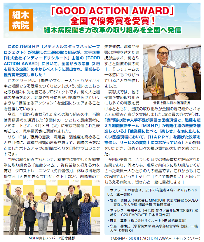 トップ 採用情報 募集要項 奨学生募集中(細木病院グループ) 看護学生、薬剤部学生が対象です クリックすると募集案内が見られます 奨学生募集案内 2027年度 新卒者 募集中 クリックすると採用試験案内と求人票が見られます ■看護師 2027年度 看護師はこちら ■薬剤師 2027年度 薬剤師はこちら エントリーフォーム ※採用試験エントリーの方は、受験希望日を記入してください ※求人に関するお問い合わせや、見学申込などもこちらのフォームからご連絡いただけます エントリーはこちらから 募集職種 既卒者、経験者は随時対応いたします (職種をクリックすると詳細が見られます) ● 医師 ● 正看護師(外来) ● 正看護師(健康管理センター) ● 正看護師(病棟) ● 正看護師(手術室) ● 正看護師(夜勤専従パート) ● 准看護師(外来) ● 准看護師(病棟) ● 介護福祉士(病棟) ● 看護助手(病棟) ● 薬剤師 ● 理学療法士 ● 作業療法士 ● 言語聴覚士 ● リハビリテーション助手 ● 臨床検査技師 ● 管理栄養士 ● 調理師 ● 厨房スタッフ(パート) ● グループホーム介護福祉士 ● グループホーム介護職員(パート) ● 訪問看護師 ● 障害者グループホーム責任者 ● 診療情報管理士 ● 医療事務 ● 医療秘書(医師事務作業補助者) ● 事務職員(入退院サポートセンター) ● 用度課スタッフ(パート) Award公式サイトはこちら 細木病院グループは高知県ワークライフバランス推進企業(4部門)の認証を取得しています PDF形式 人事総務課よりメッセージ 細木病院グループは、 小児、 成人、 老年期の方々に、急性から亜急性期、回復期、療養期、終末期まで、入院、施設、在宅の場で医療・介護を幅広く提供しています。 また、24時間対応の保育所の運営や様々な働き方の提案など、育児・介護などの私生活と仕事の両立支援を積極的におこなっています。わたしたちは、生活にも仕事にも夢を持ち、明るく前向きな方を求めています。 あなたも、わたしたちと一緒に働きませんか。 *当院は、職員の処遇改善のため、 給与のベースアップに取り組んでいます。 人事総務課 人事グループ 労働施策総合推進法に基づく正規雇用労働者数の中途採用比率について 2022年度 2023年度 2024年度 正規雇用労働者の 中途採用比率 61.1% 81.5% 80.5% 公表日:2025年5月15日 社会医療法人仁生会 細木病院 [場 所] 〒780-8535 高知市大膳町37 [連絡先] TEL 088-822-7211(代) FAX 088-825-0909(代) E-mail (採用担当) [担 当] 人事総務課 人事グループ ※細木病院の個人情報保護の考え方についてはサイト下部「個人情報保護方針およびポリシー」をご確認下さい
